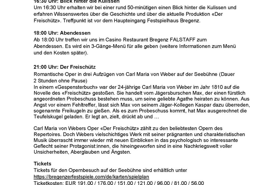 16:30 Uhr: Blick hinter die Kulissen Um 16:30 Uhr erhalten wir bei einer rund 50-minütigen einen Blick hinter die Kulissen und erfahren Wissenswertes über die Geschichte und über die aktuelle Produktion «Der Freischütz». Treffpunkt ist vor dem Haupteingang Festspielhaus Bregenz. … Weiterlesen »Festspieltreffen Seebühne Bregenz