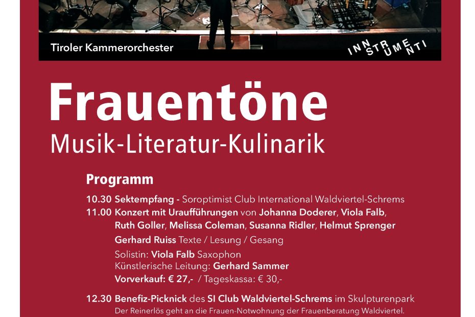 In Zusammenarbeit mit dem Kunstmuseum Waldviertel in Schrems und dem MUSIKWELTEN Festival lädt der SI Club Waldviertel-Schrems zu einer einzigartigen Musik-Literatur-Matinée und einem anschließenden köstlichen Benefiz-Picknick im Skulpturenpark des Museums. Unter dem Titel „Frauentöne“ spielt das Tiroler Kammerorchester InnStrumenti Uraufführungen… Weiterlesen »Benefiz-Picknick mit Musik-Literatur-Matinée „Frauentöne“ im Kunstmuseum