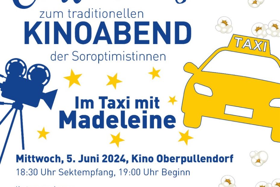 Herzliche Einladung zu einem inspirierenden Abend voller Spannung und Emotionen! 🎬 Am 5. Juni 2024 zeigen wir im Kino Oberpullendorf den Film ‚Im Taxi mit Madeleine‘. Seid dabei und lasst euch von dieser bewegenden Geschichte mitreißen! 🌟 Kartenreservierung: oberpullendorf@soroptimist.at